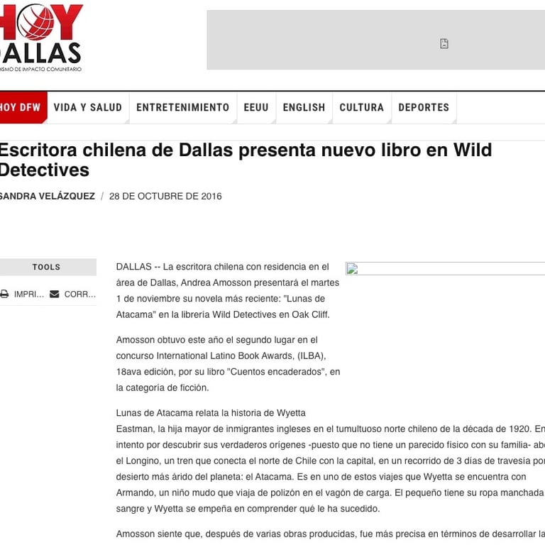La luna es la clave: misteriosa, femenina, cambiante. La cara que nos muestra no es ni falsa ni verdadera. Por todo ello y más, es la única capaz de enfrentarse al desierto, a este desierto que también viene marcado con signo de mujer: es la Atacama y, como tal, seduce y atrapa. A Wyetta (así se llama la protagonista de esta nueva novela de Amosson) la luna le ha dejado una constelación en el cuerpo, indicándole el camino, invitándola a viajar. Y ella acepta el llamado sin dudar, ni por un instante, en que su intuición es cierta y nos convence y la seguimos. En ese momento olvidamos que la la luna tiene caras diversas...